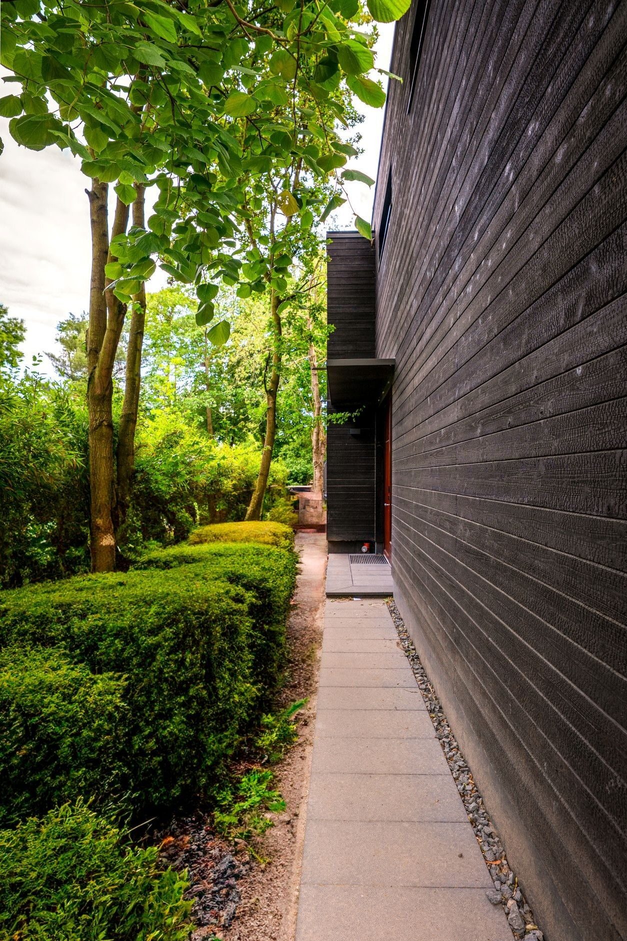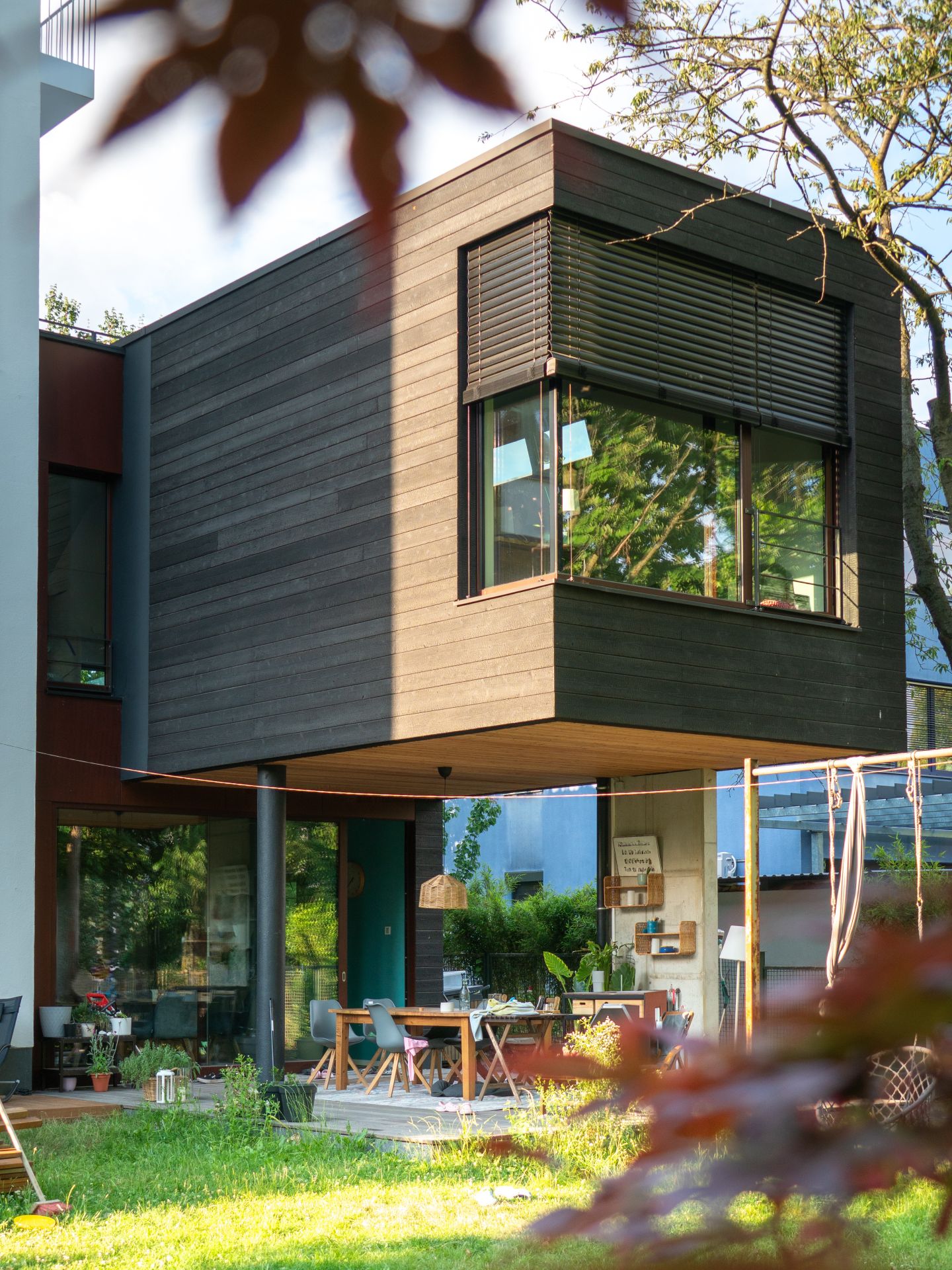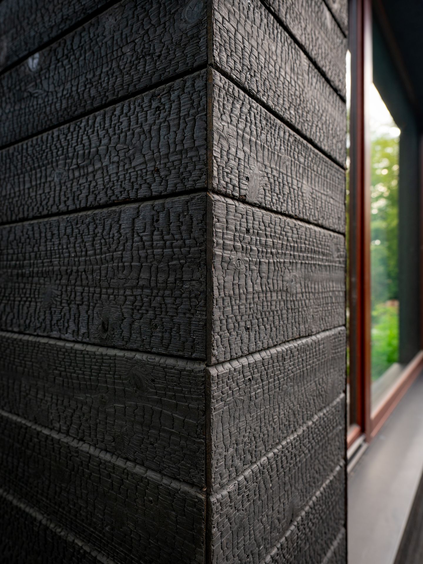 On a verdant plot in Berlin, a former embassy has been transformed into a contemporary live–work house. The existing structure—clean plastered volumes, large openings, a calm grid—sets the stage for a new cubic addition clad entirely in Nakamoto Forestry Suyaki. The deeply charred yakisugi forms a precise, almost floating accent: a black, tactile skin that absorbs light, reveals the wood’s grain, and lends new depth to the ensemble.