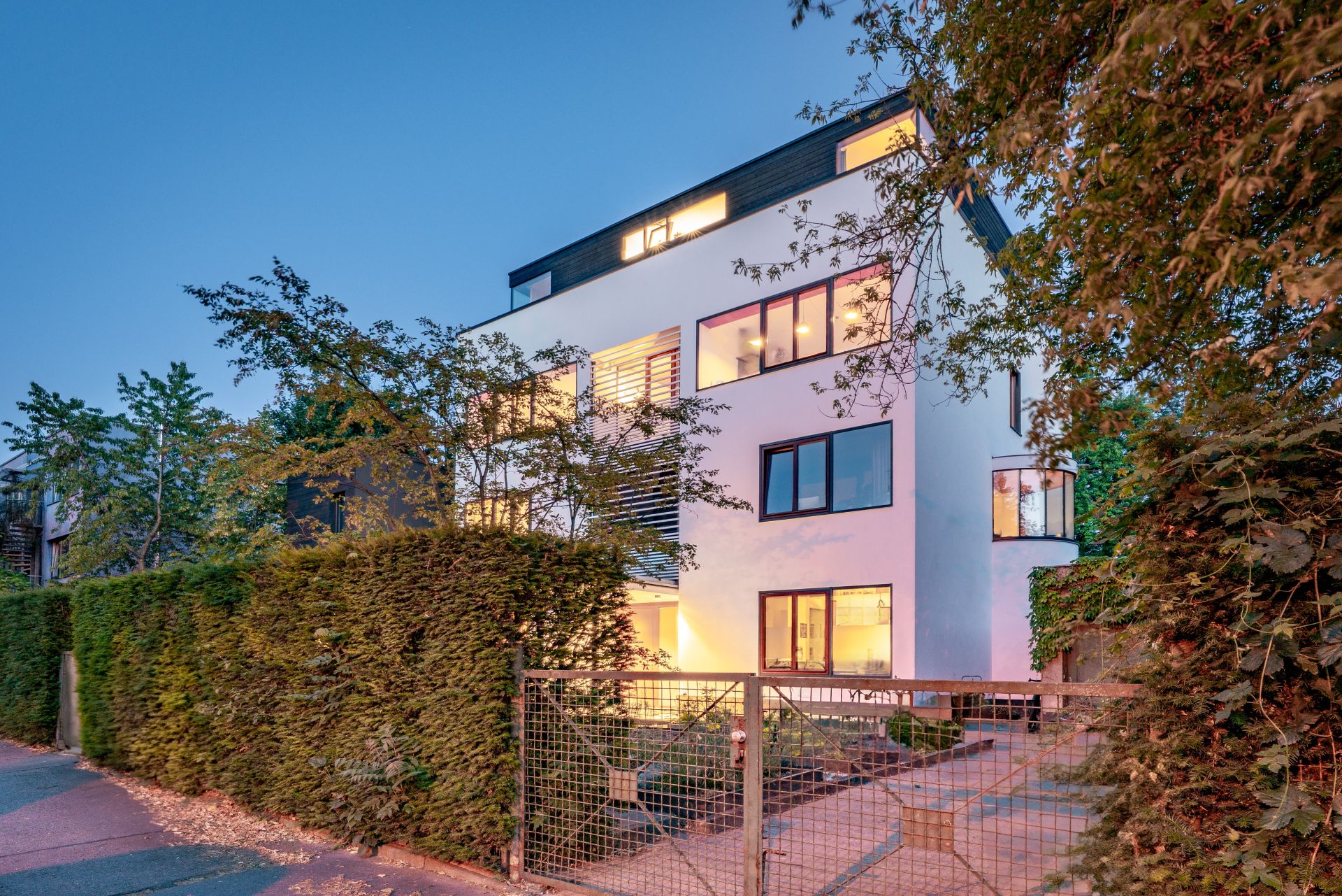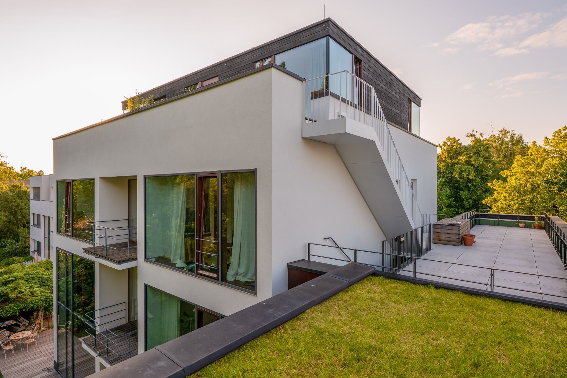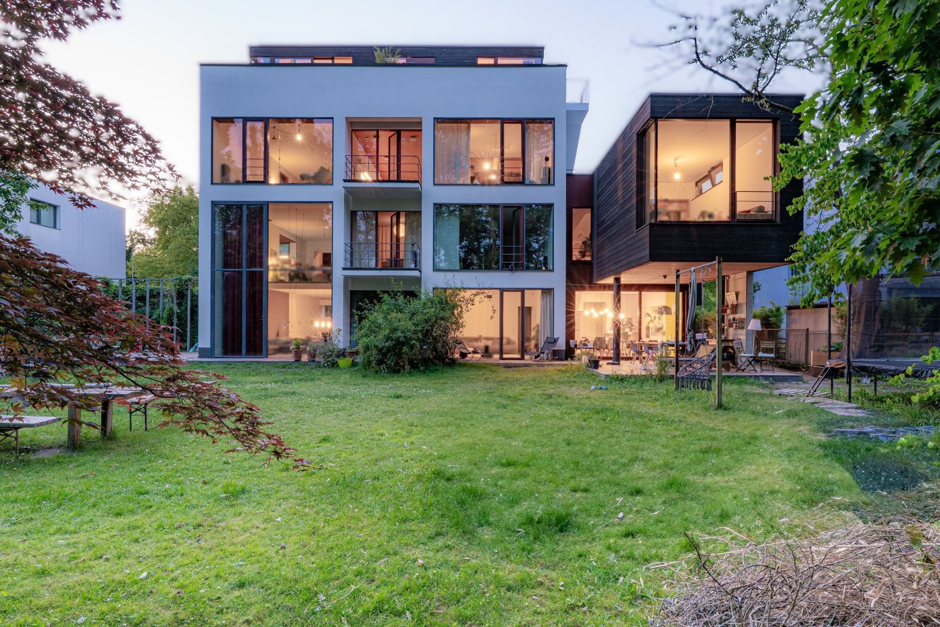 On a verdant plot in Berlin, a former embassy has been transformed into a contemporary live–work house. The existing structure—clean plastered volumes, large openings, a calm grid—sets the stage for a new cubic addition clad entirely in Nakamoto Forestry Suyaki. The deeply charred yakisugi forms a precise, almost floating accent: a black, tactile skin that absorbs light, reveals the wood’s grain, and lends new depth to the ensemble.