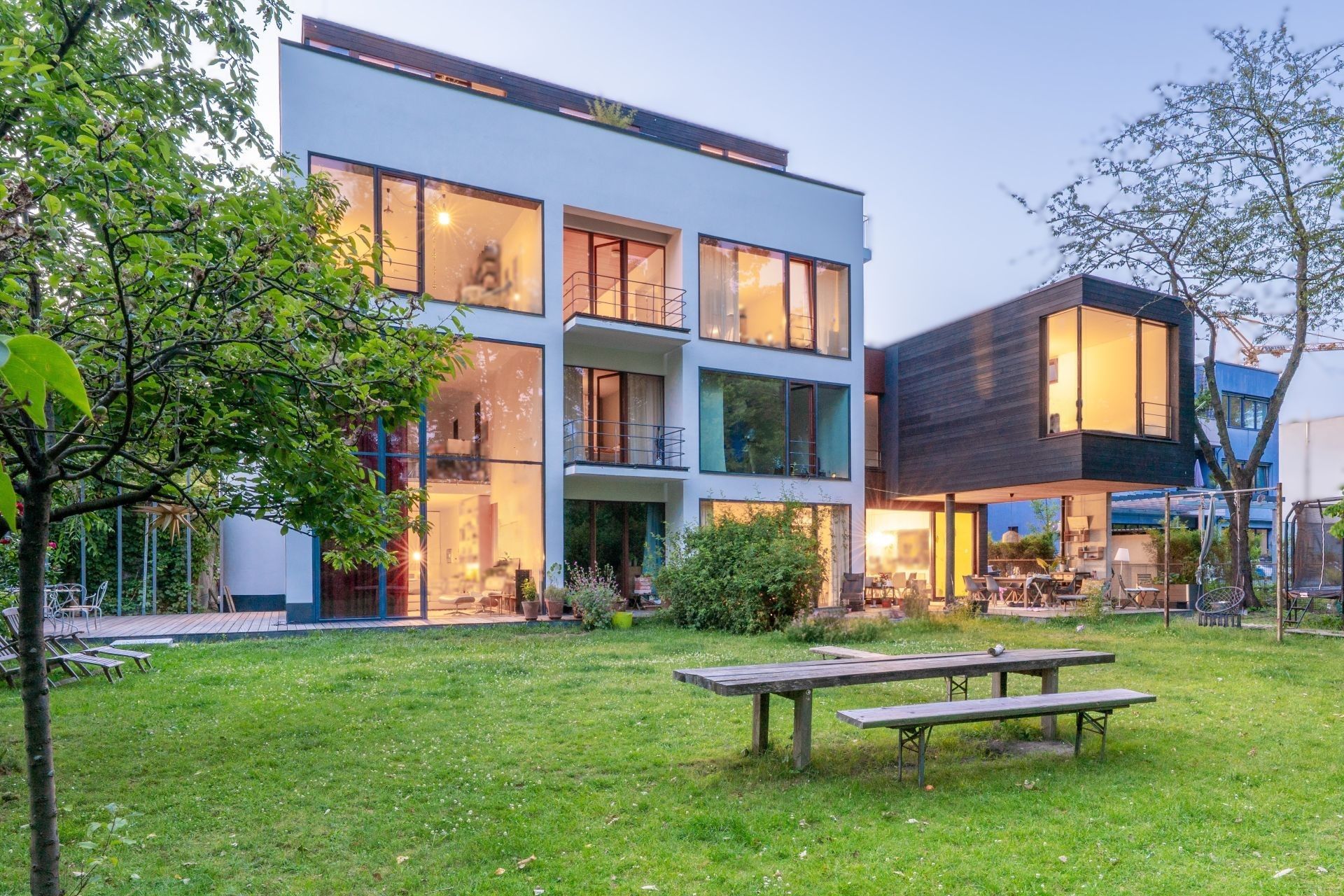 The composition thrives on contrast: white and black, smooth and textured, existing architecture and contemporary intervention. Generous glazing cuts into the façade like picture frames, reflecting the garden’s greenery and opening studio and living areas to the landscape. Beneath the cantilevered volume, sheltered outdoor rooms emerge—an extended workshop in summer, a covered dining space in the evening.